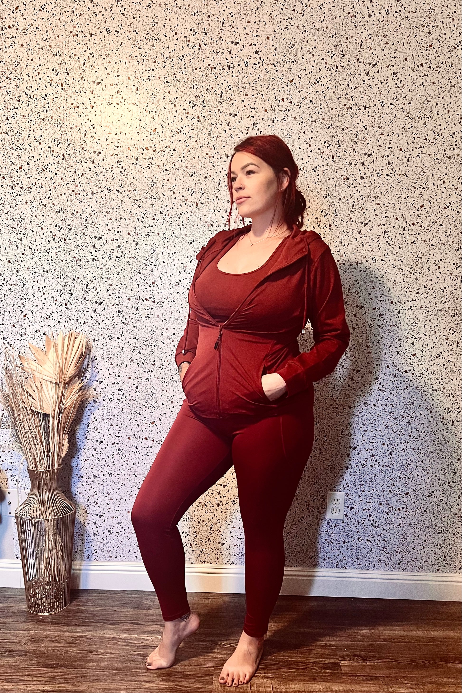 - 3-piece set: long sleeve zip-up hoodie, active leggings with side pockets, and padded sports bra (removable pads)