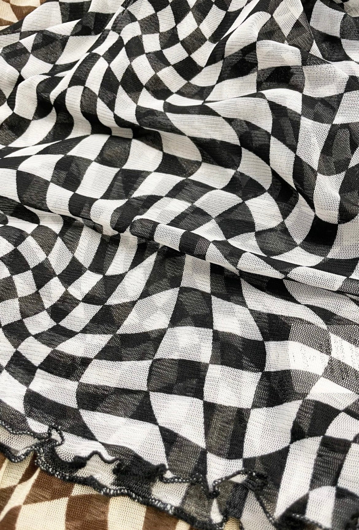 This cropped top features a bold checkered print, a soft and stretchy sheer mesh fabric, and stylish lettuce trim on the hem and cuffs. The slight mock neck and thumbhole cuffs add a trendy, body-hugging fit that’s both edgy and comfortable.