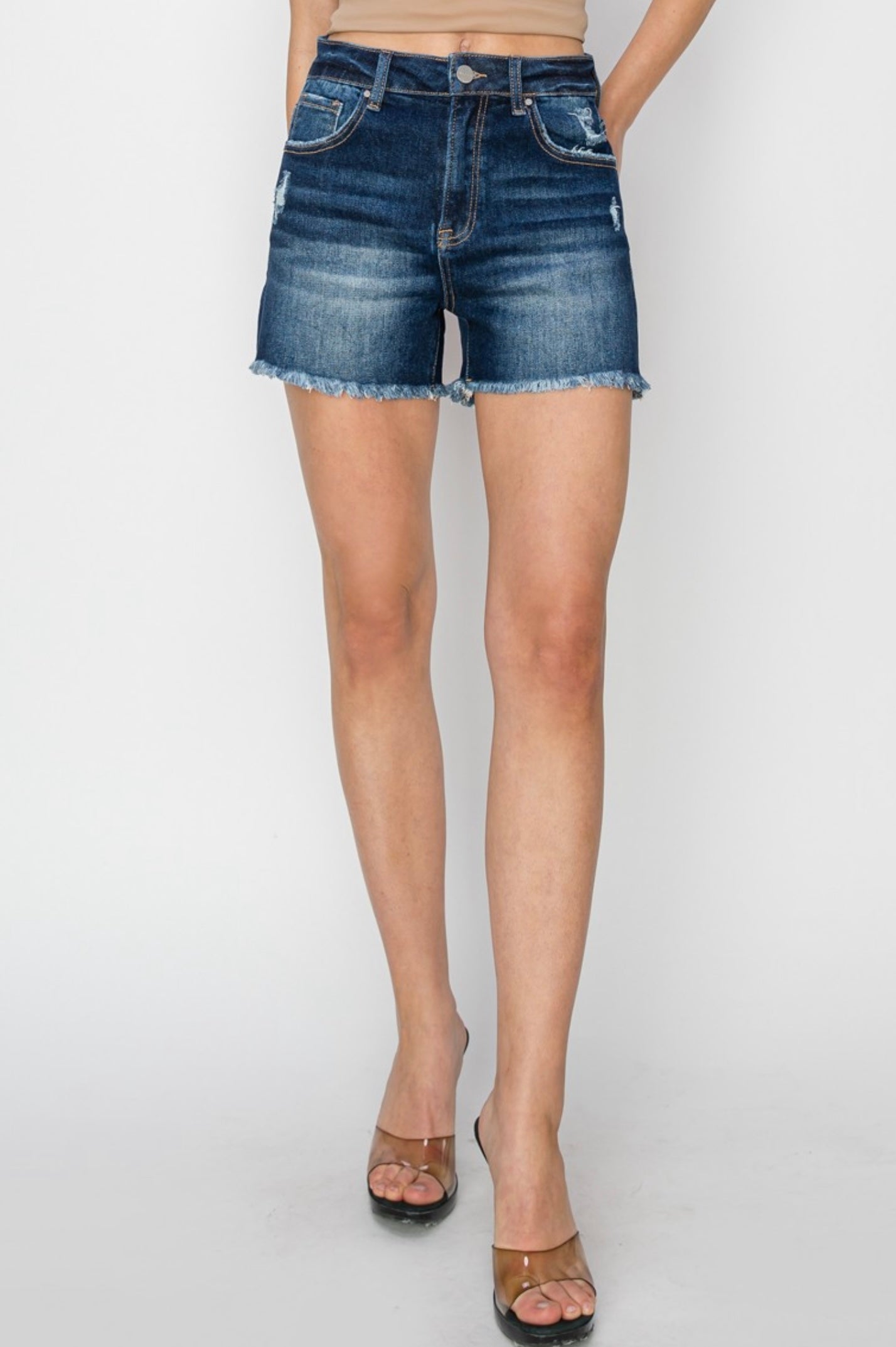 Our favorite denim brand Risen is back again with these high rise dark wash denim shorts